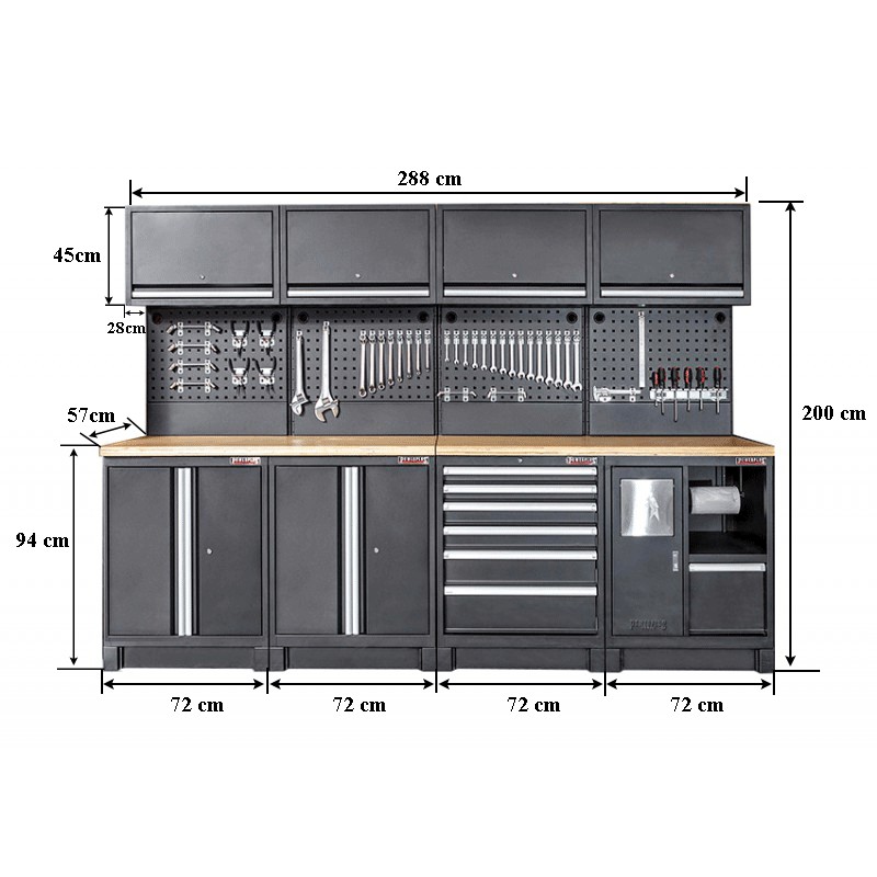 Maße Werkzeugschrank: 72 x 57 x 90 cm. (B x T x H, Außenmaße ohne Arbeitsplatte)