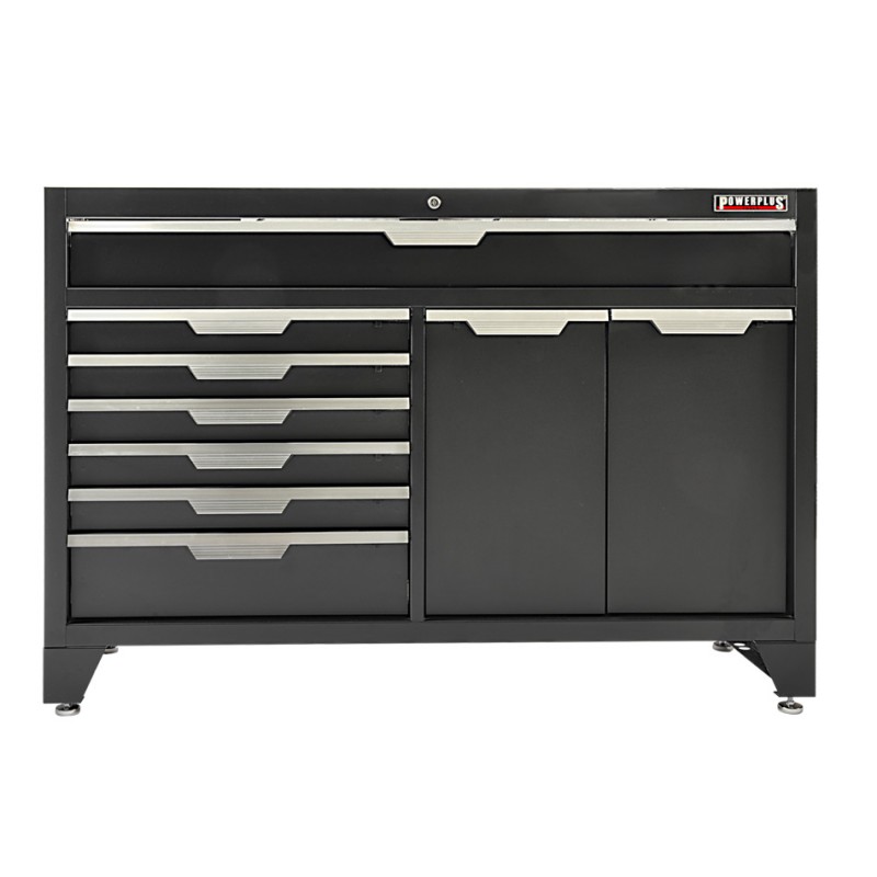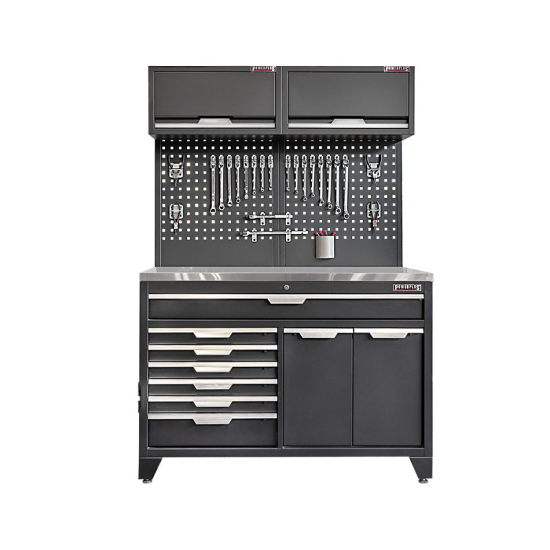 Optimieren Sie Ihre Werkstatt mit unserem eleganten Mattschwarzen Werkstatt-Set PBR5 mit Metallarbeitsplatte und den Gesamtmaßen von 136x61x200 cm.