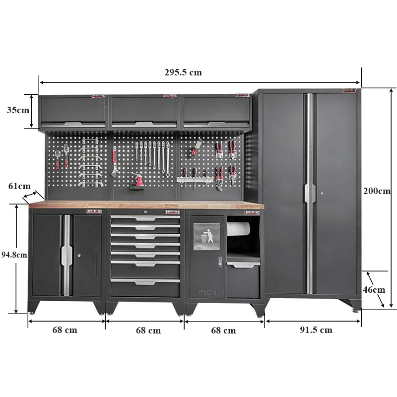 Robustes Werkstatt Set mit einem hohem und breiten Schrank in Mattschwarz PBH14 mit Hartholzarbeitsplatte und den Gesamtmaßen von 295,5x61x200 cm.