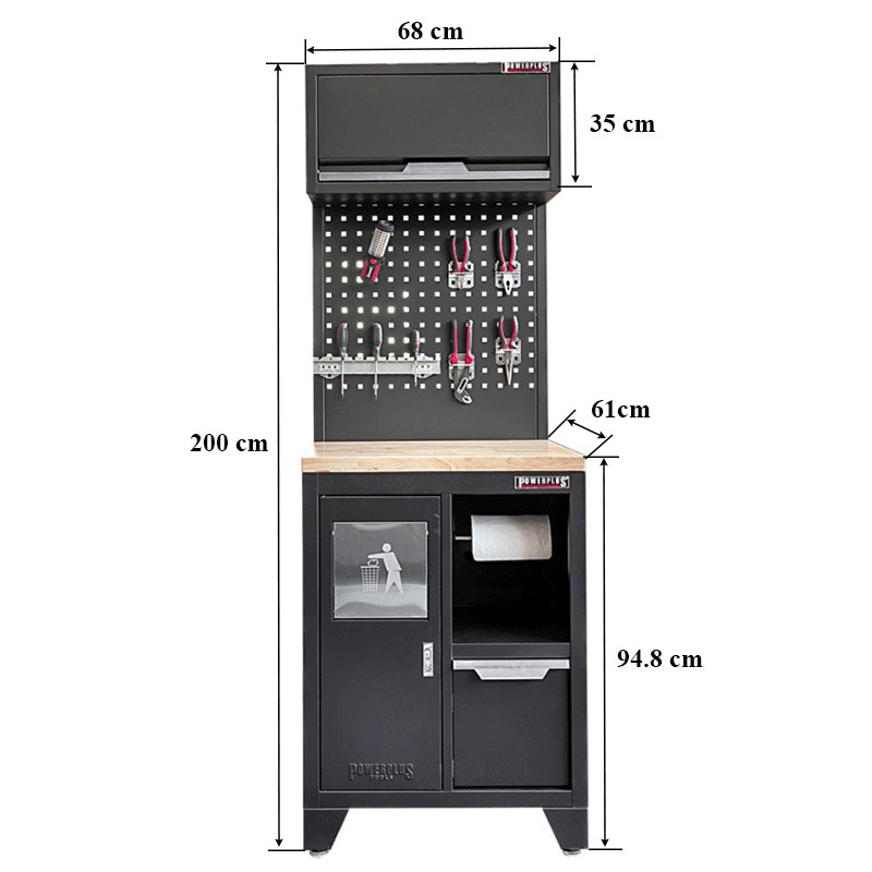 Optimieren Sie Ihre Werkstatt mit unserem praktischen Mattschwarzen Werkstatt-Set PBH2 mit Hartholzplatte in den Gesamtmaßen von 68x61x200 cm.