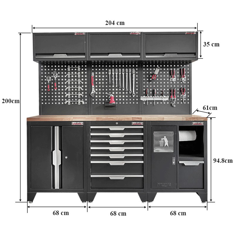 Elegantes Werkstatt Set in Mattschwarzen PBH8 mit Hartholzarbeitsplatte und den Gesamtmaßen von 204x61x200 cm.