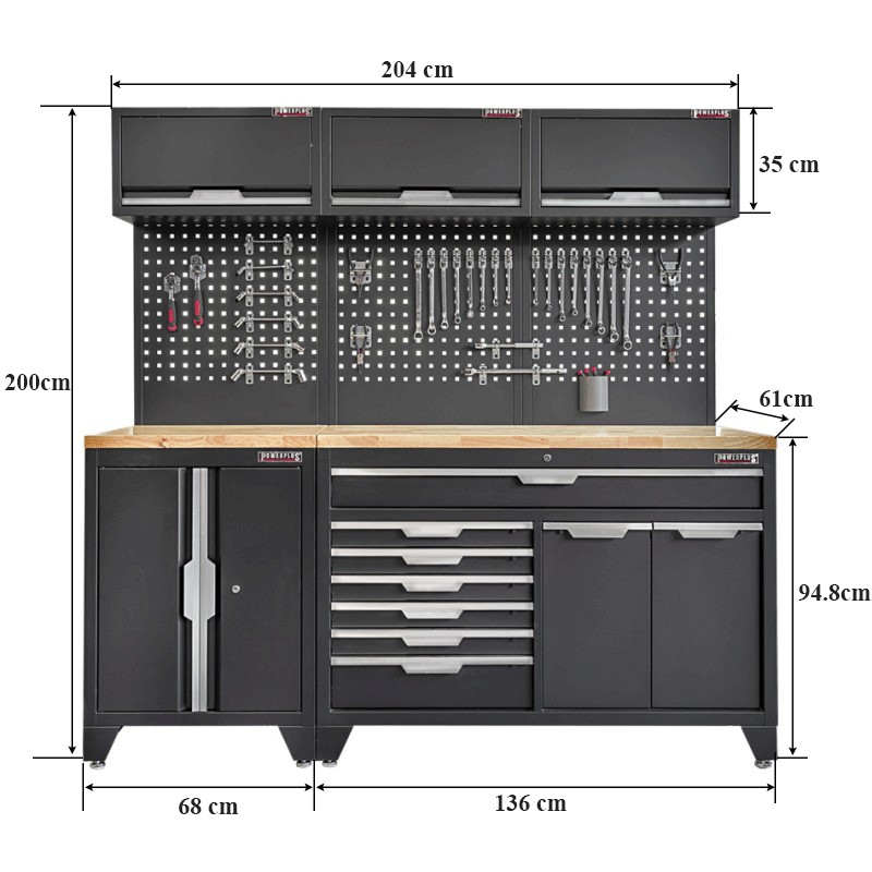 Werkstatt Set in Mattschwarzen PBH12 mit Hartholzarbeitsplatte und den Gesamtmaßen von 204x61x200 cm.