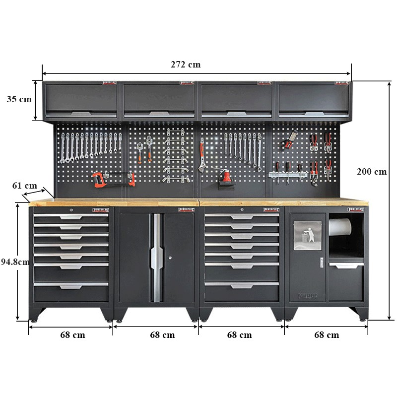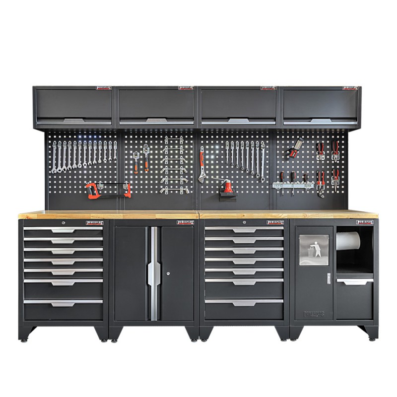 Elegantes Werkstatt Set in Mattschwarzen PBH16 mit Hartholzarbeitsplatte und den Gesamtmaßen von 272x61x200 cm.