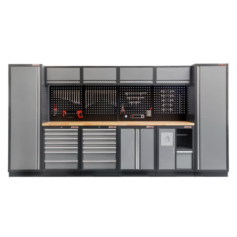 Stabiles Werkbank Set 392 cm mit Hartholzplatte und Mattschwarzer Lochwand bestehend aus: