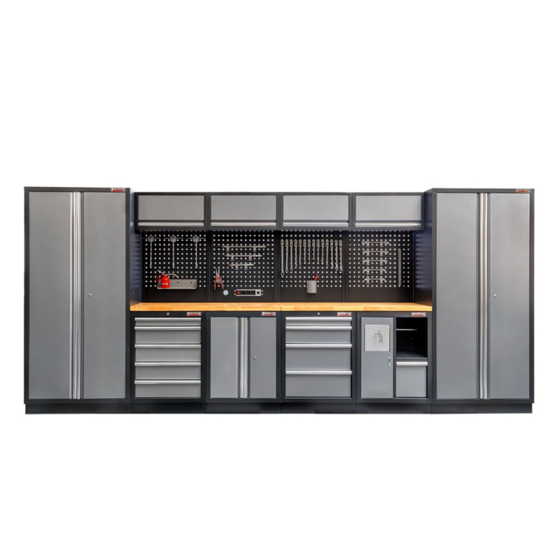 Komplette Werkstatteinrichtung 455 cm mit Hartholzplatte und Mattschwarzer Lochwand bestehend aus: