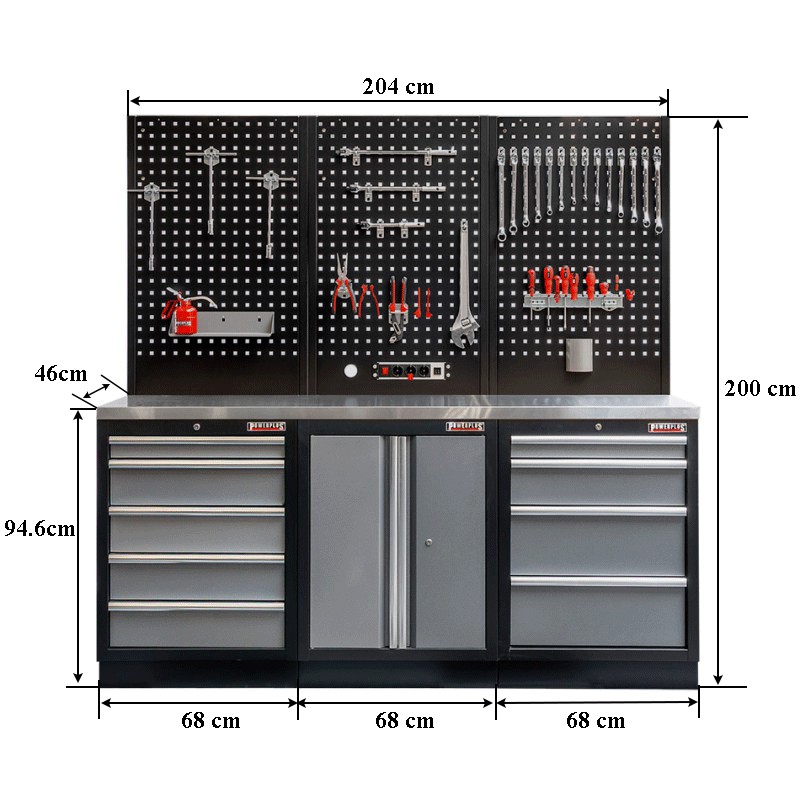 Maße Werkzeugschrank: 68 x 46 x 91 cm (B x T x H, Außenmaße ohne Arbeitsplatte)