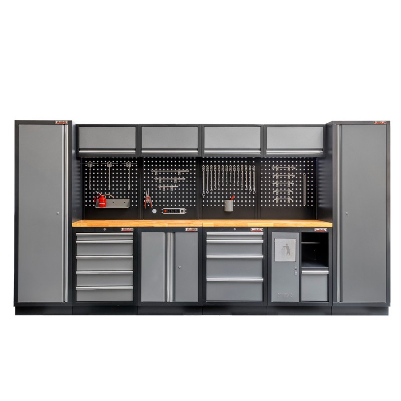 Stabiles Werkbank Set 392 cm mit Hartholzplatte und Mattschwarzer Lochwand bestehend aus: