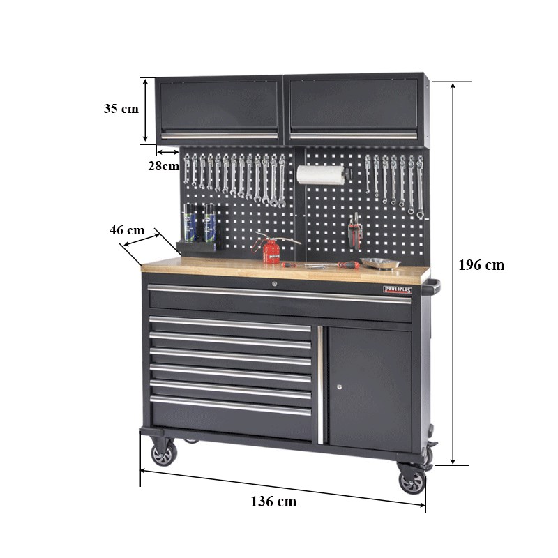 Die Abmessungen von 136 (143 cm einschl. Griffstange) x 46 x 196 cm (L x B x H) machen sie zu einem großzügigen Arbeitsbereich der zusätzlichen Komfort bietet.
